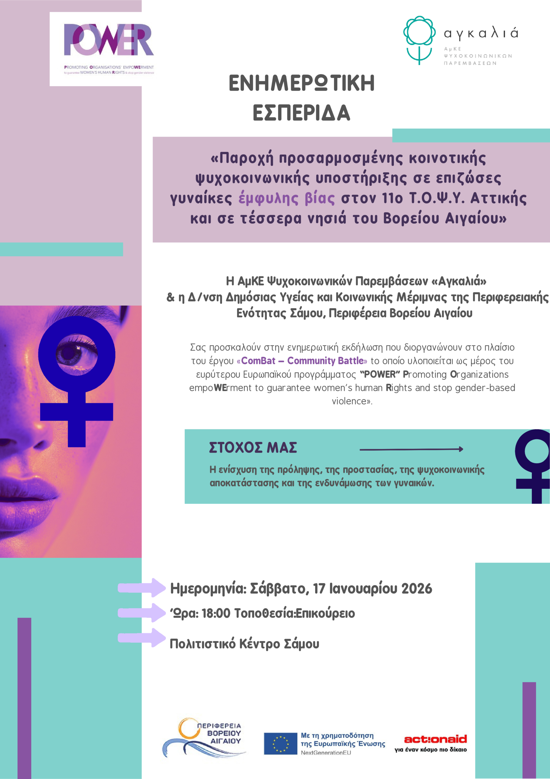 «Παροχή προσαρμοσμένης κοινοτικής ψυχοκοινωνικής υποστήριξης σε επιζώσες γυναίκες έμφυλης βίας στον 11ο Τ.Ο.Ψ.Υ. Αττικής και σε τέσσερα νησιά του Βορείου Αιγαίου»