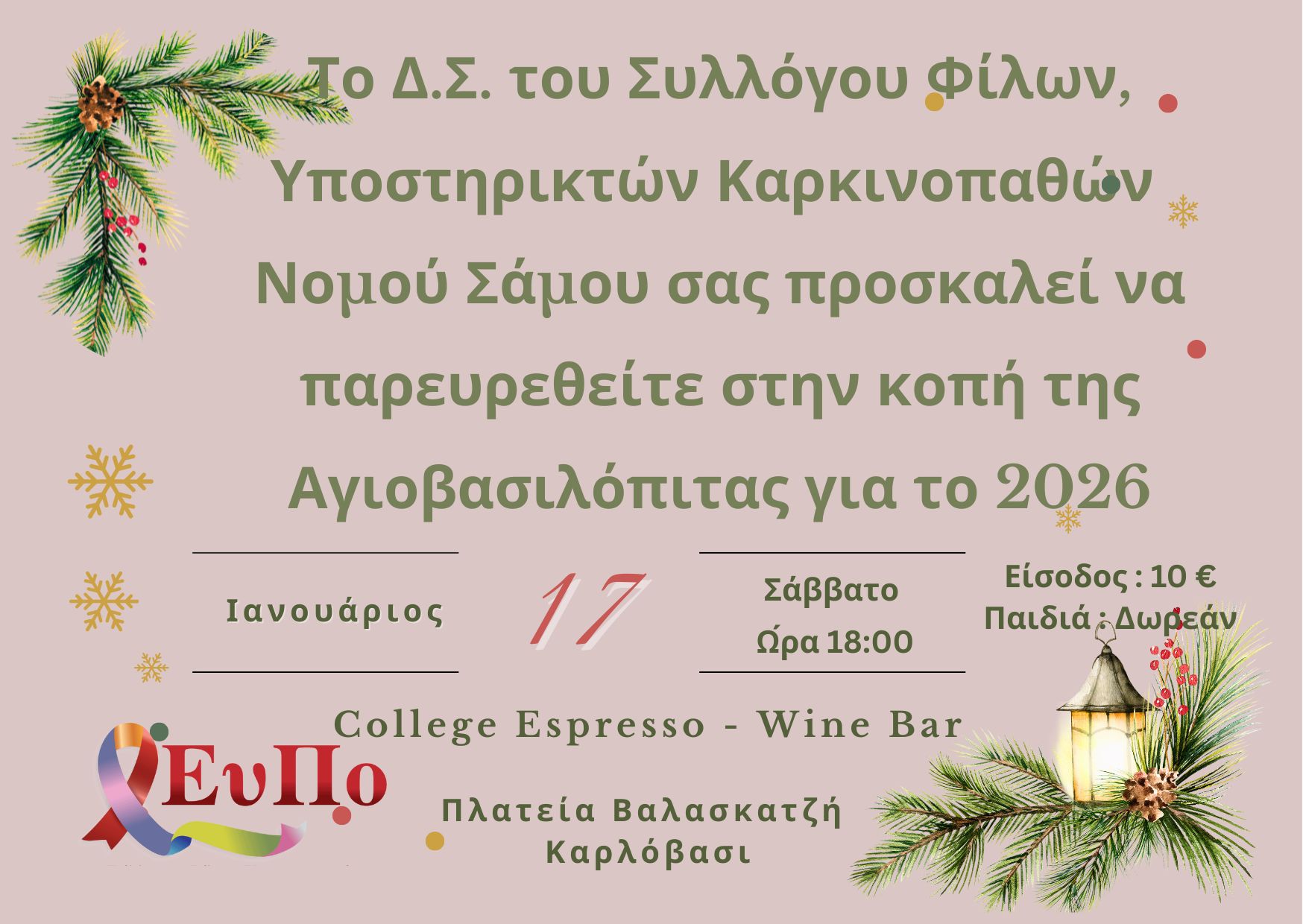 Ο Σύλλογος Φίλων Υποστηρικτών Καρκινοπαθών Νομού Σάμου απευθύνει πρόσκληση για την κοπή της Αγιοβασιλόπιτας, το Σάββατο στις 17 Ιανουαρίου στις 18:00 στο College Espresso-Wine Bar στην Πλατεία Βαλασκατζή στο Καρλόβασι.
