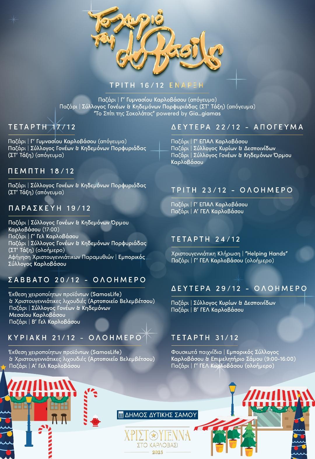 Ο Δήμος Δυτικής Σάμου προσκαλεί μικρούς και μεγάλους, από τις 16 Δεκεμβρίου, να επισκεφθούν το χριστουγεννιάτικο χωριό που ανοίγει τις πόρτες του στο Καρλόβασι.
