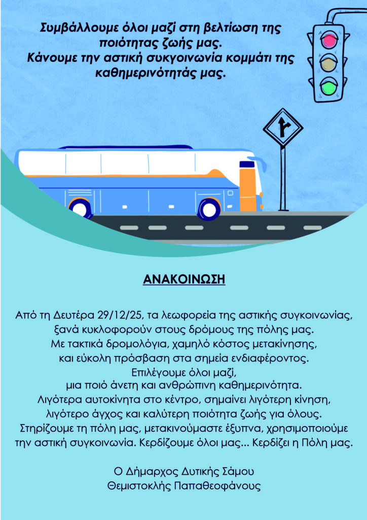 >  Ανακοινώσεις   >  29.12.2025 ΔΕΛΤΙΟ ΤΥΠΟΥ ΑΠΟ ΔΕΥΤΕΡΑ 29.12.2025 ΤΑ ΛΕΩΦΟΡΕΙΑ ΤΗΣ ΑΣΤΙΚΗΣ ΣΥΓΚΟΙΝΩΝΙΑΣ ΞΑΝΑ ΚΥΚΛΟΦΟΡΟΥΝ ΣΤΗΝ ΠΟΛΗ ΜΑΣ