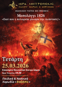 ΙΕΡΑ ΜΗΤΡΟΠΟΛΙΣ ΣΑΜΟΥ ΙΚΑΡΙΑΣ Κ' ΚΟΡΣΕΩΝΕΚΔΗΛΩΣΗ ΠΙΣΤΗΣ ΚΑΙ ΜΝΗΜΗΣΜεσολόγγι 1826 «Εκεί που η πολιορκία γέννησε την Ανάσταση!»Τετάρτη 25.03.2026 Επικούρειο Πολιτιστικό