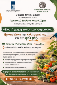 Ο Δήμος Δυτικής Σάμου σε συνεργασία με τον Γεωπονικό Σύλλογο Νομού Σάμου, διοργανώνουν εσπερίδα με θέμα: «Σωστή χρήση γεωργικών
