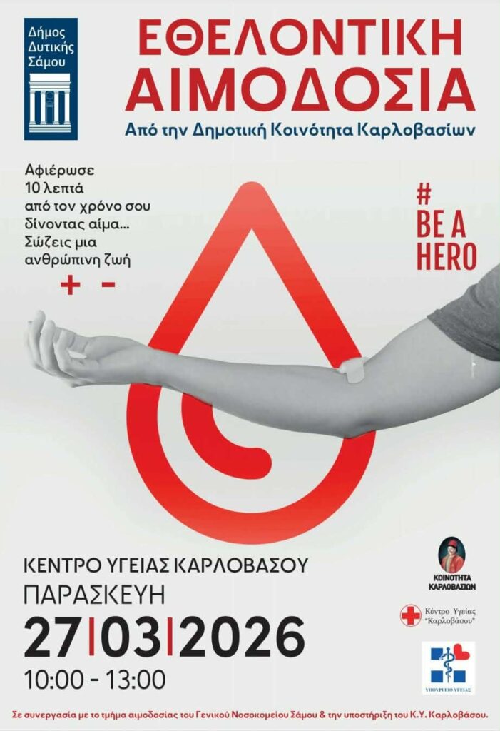 Την Παρασκευή 27 Μαρτίου 2026 από τις 10:00 π.μ. έως τις 13:00 θα πραγματοποιηθεί στο Κέντρο Υγείας Καρλοβασίου από